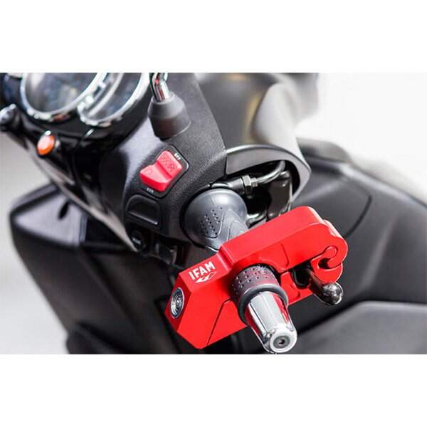 Candado antirrobo Ifam RPM con anclaje a la maneta y a la empuñadura del manillar de color rojo. Ref. 054300R