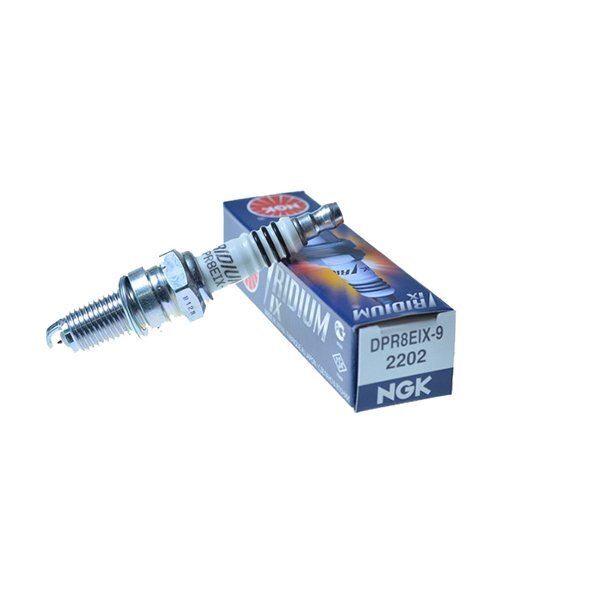 Bujia de iridio NGK modelo DPR8EIX9 de cuello largo y grado termico 8, diseñada para mejorar notablemente la respuesta y arranque de la moto.