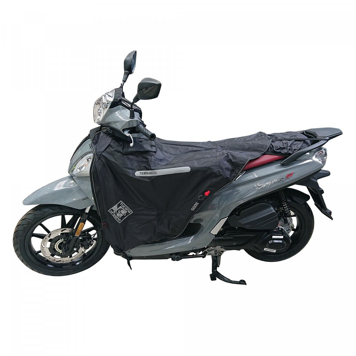 Cubre piernas impermeable del fabricante Italiano Tucano para moto Sym Symphony ST Euro 5 de 2022 en adelante donde demuestra que se puede montar con frío en scooter. Ref: R227X
