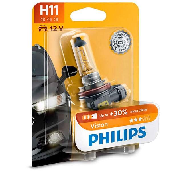 Mejore su visión con esta lampara halognea de Philips Vision H11 55W de 12V totalmente homologada , esta bombilla mejora su vision en un 30% aumentando de esta manera su seguridad en carretera, tanto si viaja en moto como en coche.