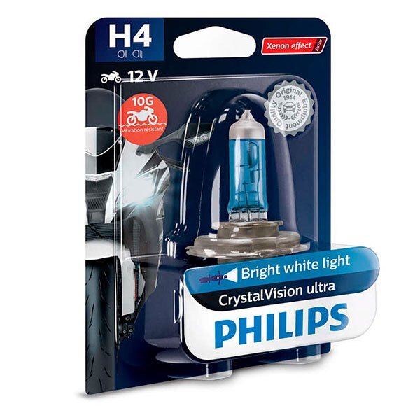Mejore su visión con esta lampara halognea de Philips CrystalVision Ultra H4 60/55W de 12V totalmente homologada , esta bombilla mejora el haz de luz dotando al motorista de una mejor visión en carretera con un elegante efecto Xenon