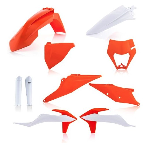 Descubre el Kit Plásticos Acerbis para KTM EXC-350F 2020-2023, que incluye guardabarros en blanco y naranja, fabricado en resina termoplástica de alta calidad, ideal para mejorar la estética y funcionalidad de tu moto.